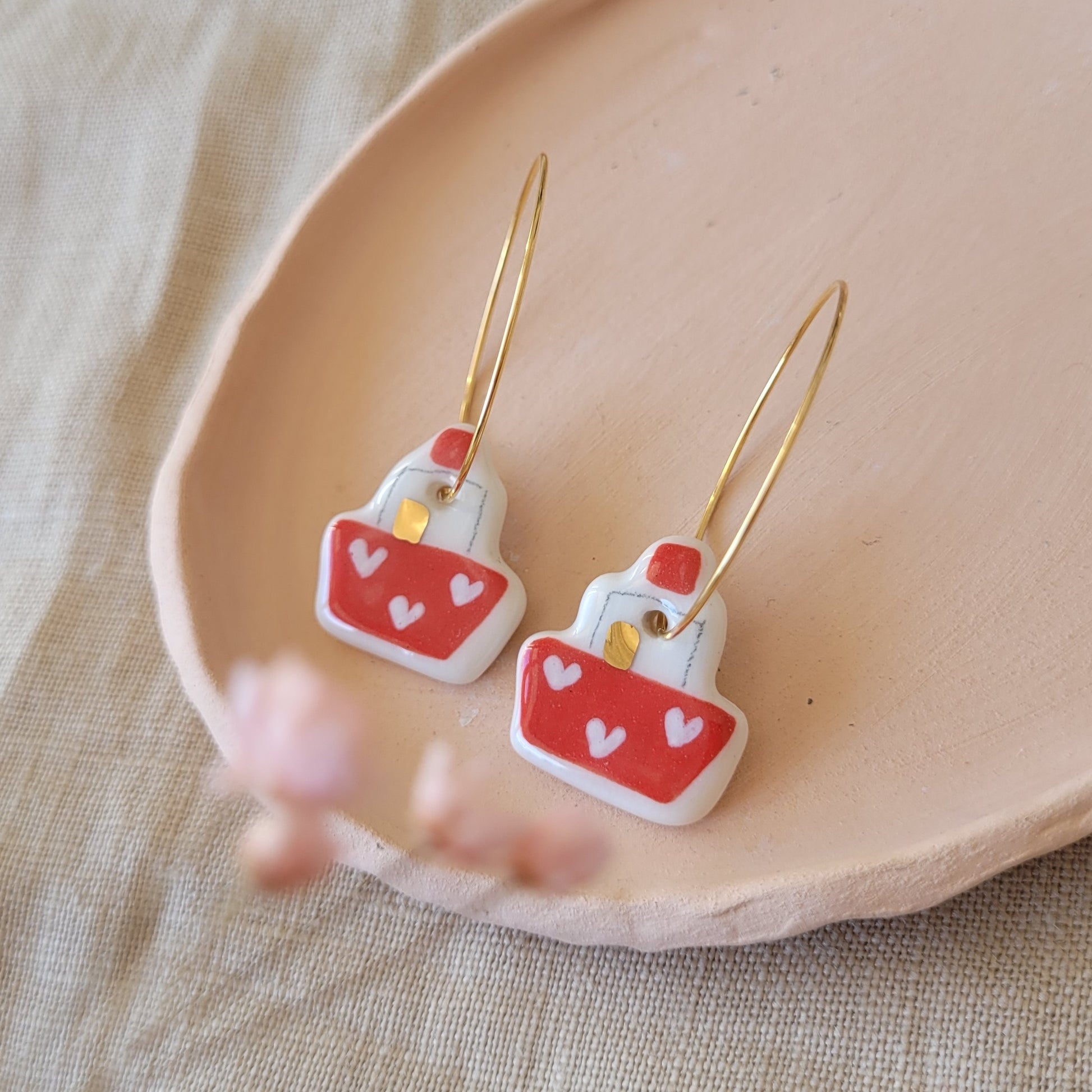A pair of handmade and hand painted porcelain dangle earrings, decorated with genuine liquid gold.