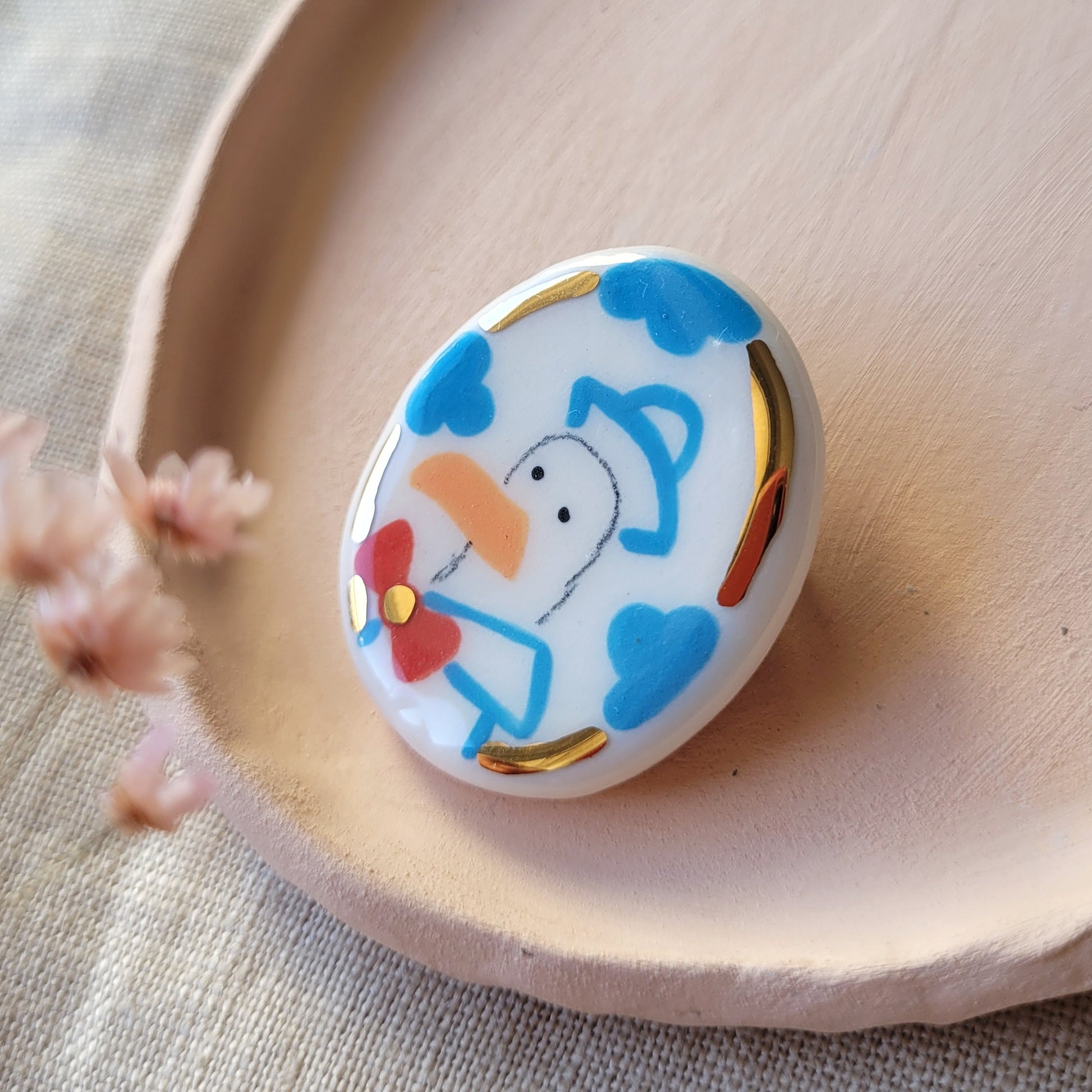 Handmade and hand painted porcelain brooch, decorated with genuine liquid gold.