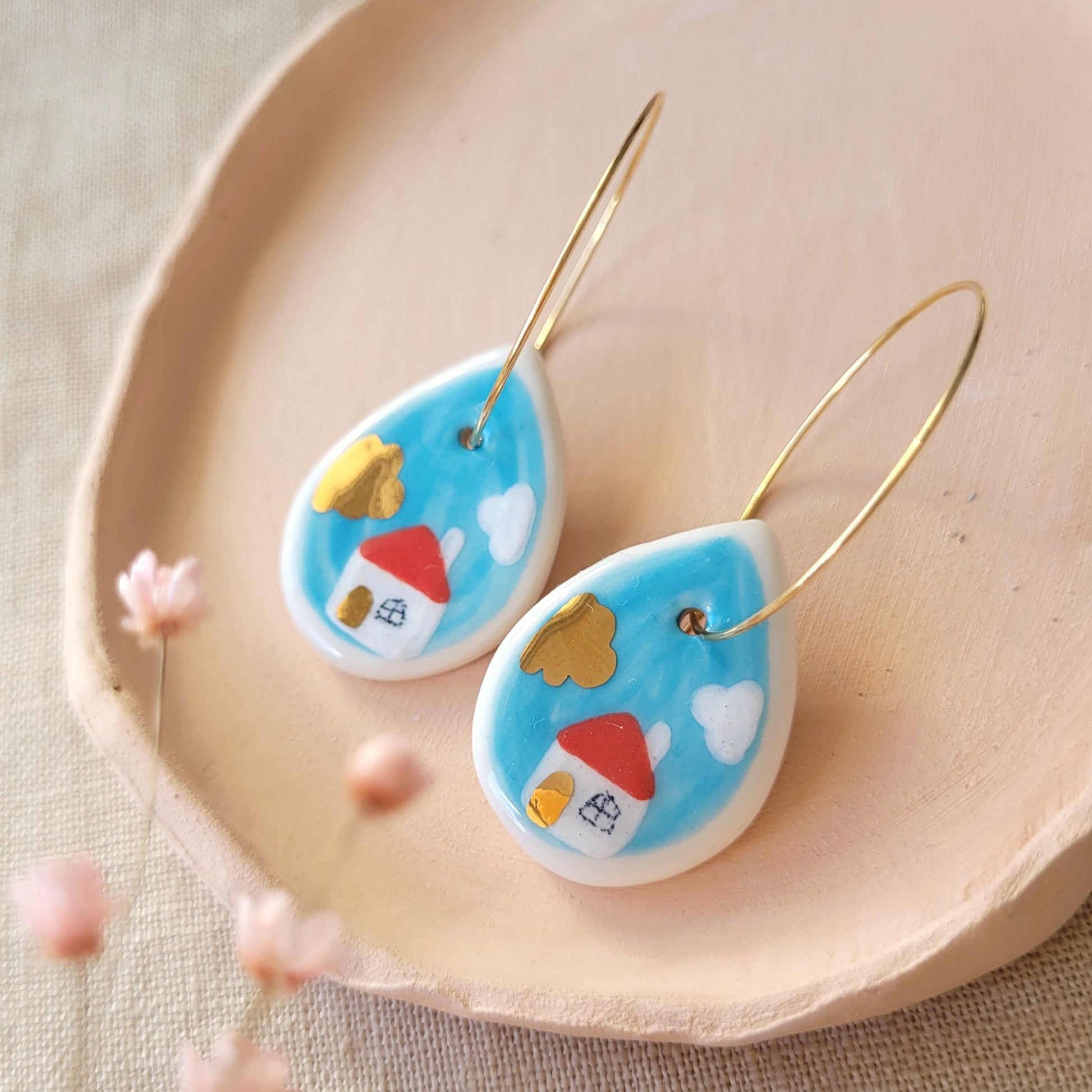 A pair of handmade and hand painted porcelain dangle earrings, decorated with genuine liquid gold.
